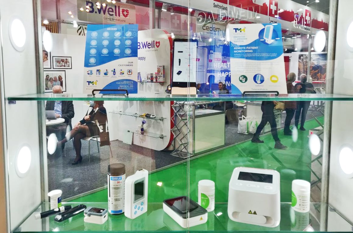 Программно-аппаратный комплекс “ТелеМедХаб” был представлен на коллективном стенде. В экспозицию были включены устройства для удаленного мониторирования: классические — такие как термометры, пульсоксиметры и тонометры и специфические амбулаторные — такие как анализаторы крови, мочи, лабораторные установки формата point-of-care testing (POCT/bedside testing).